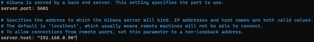 Décommenter aussi les attributs server.port et server.host, remplacer localhost par l'adresse IP depuis laquelle Kibana devrait être joignable sur le réseau, puis enregistrer le fichier :